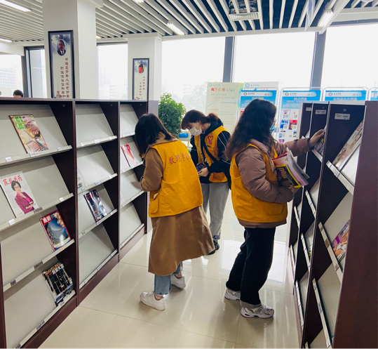 随后,我院志愿者一行来到校图书馆与图书馆党支部一起进行志愿活动。党员老师和同学们整理书架、维护环境,帮助同学们培养良好的借阅习惯。大家在培养自身素质的同时也带动更多的人参加志愿活动,争做向善青年。